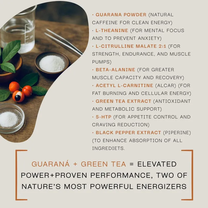 Materials: Guarana, L Theanine, Citrulline Malate, Beta Alanine, Acetyl L Carnitine, Green Tea Extract, 5 HTP, Piperine